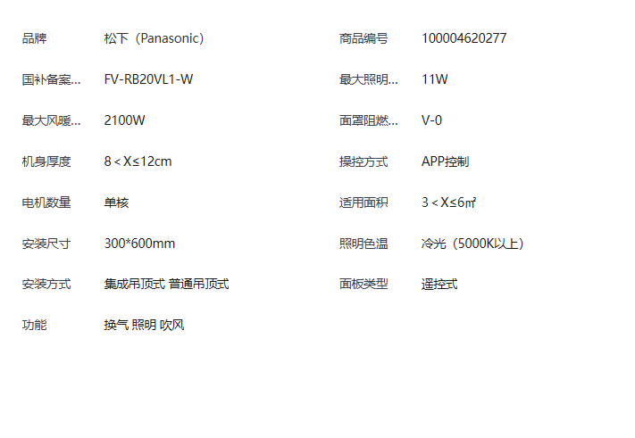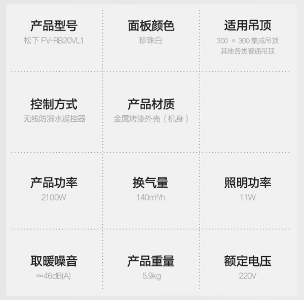 松下(Panasonic)智能浴霸风暖 FV-RB20VL1暖风照明排气一体 浴室暖风机